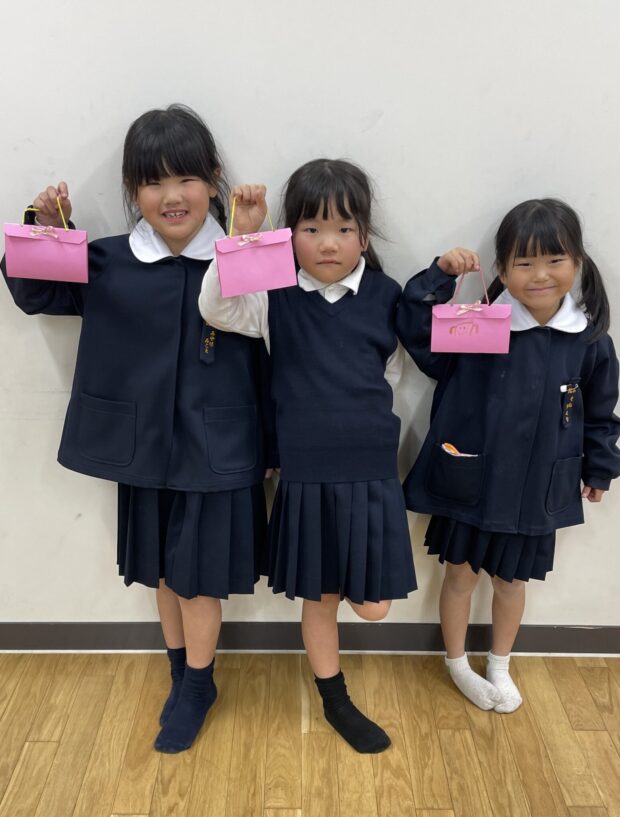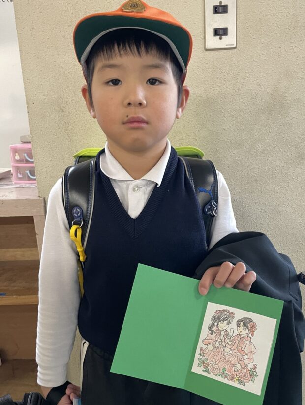イラストに綺麗に色を塗って、キラキラのシールを貼って、折りたたんでバッグ型になるカードを大切な人のために一生懸命作りました。
