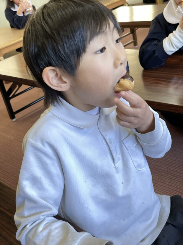 2月3日は節分ですね。毎年、恵方巻をおやつに出していたのですが、その日はおうちでも恵方巻だった子も多く、今年は代わりにエクレアにしてみました。