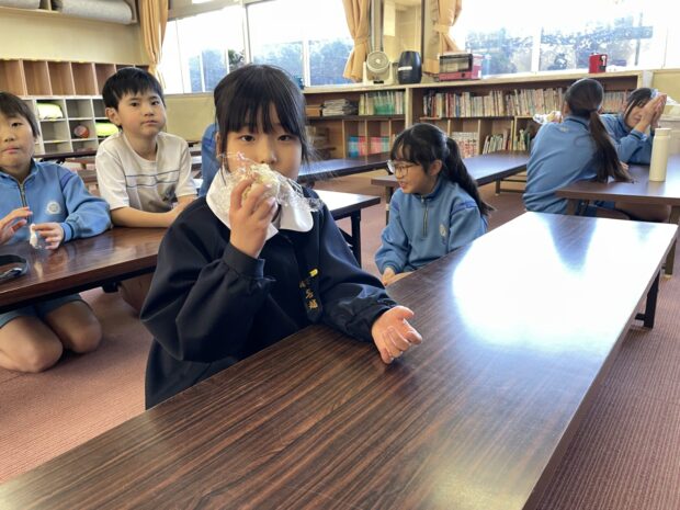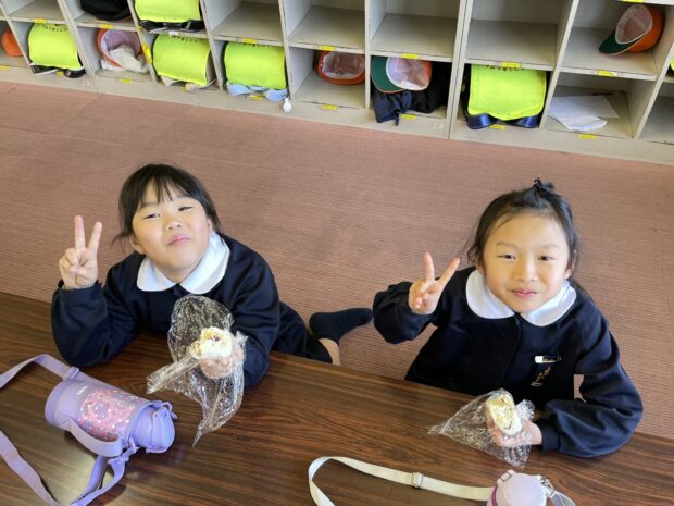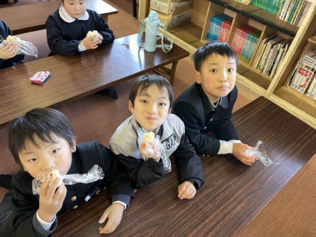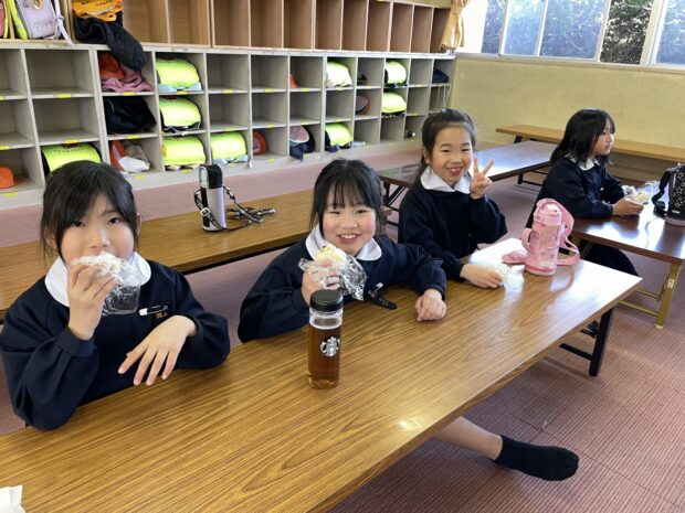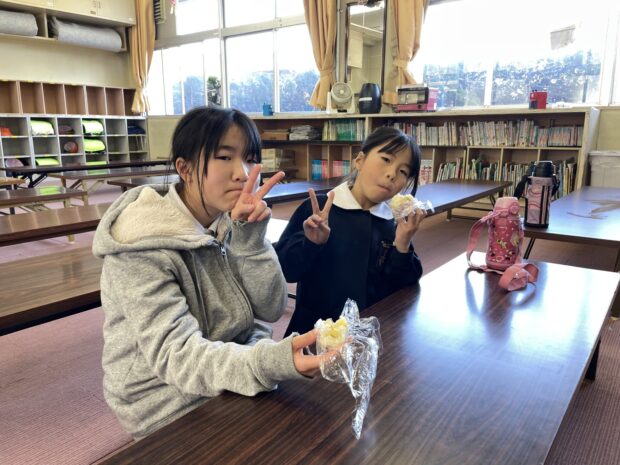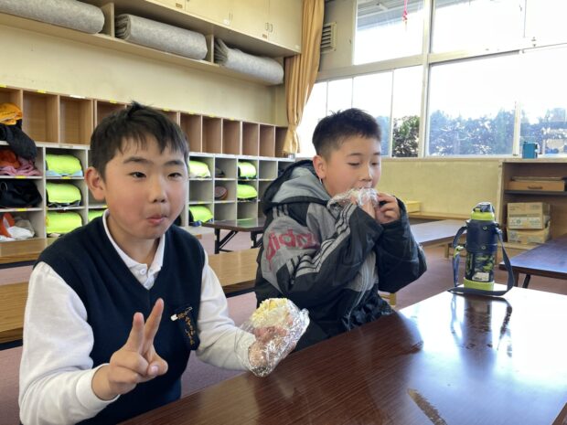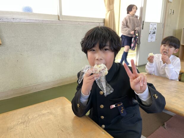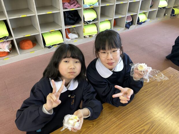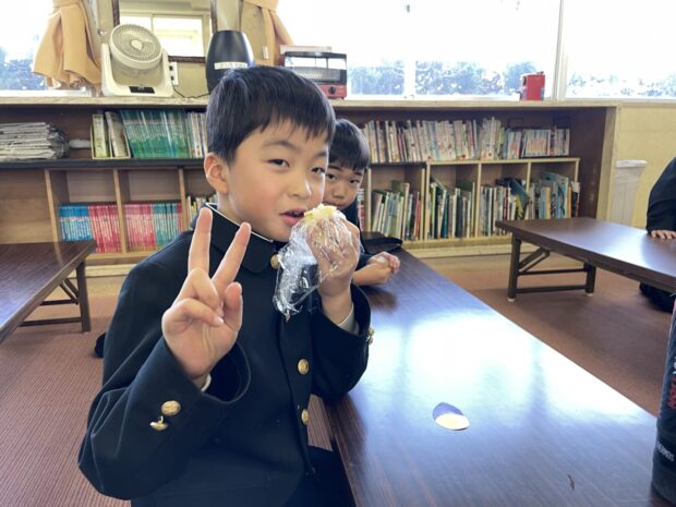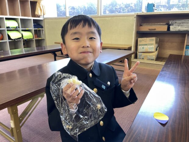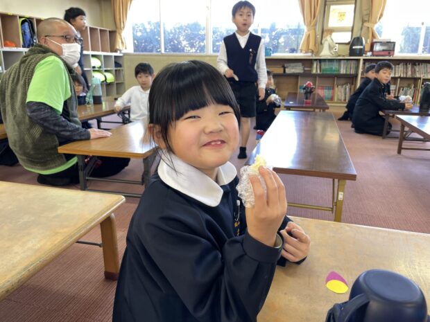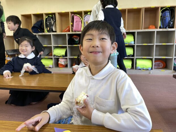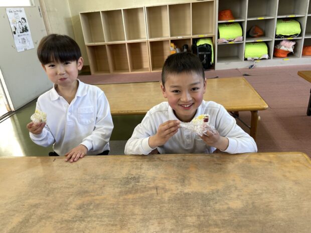 徳島県の三辻さんが作って阿部さんが運んでくれたお芋と、香川県の図子さんが作ったお米をうらしまキッズ詫間とうりぼうキッズ山本のスタッフがおにぎりにしました。